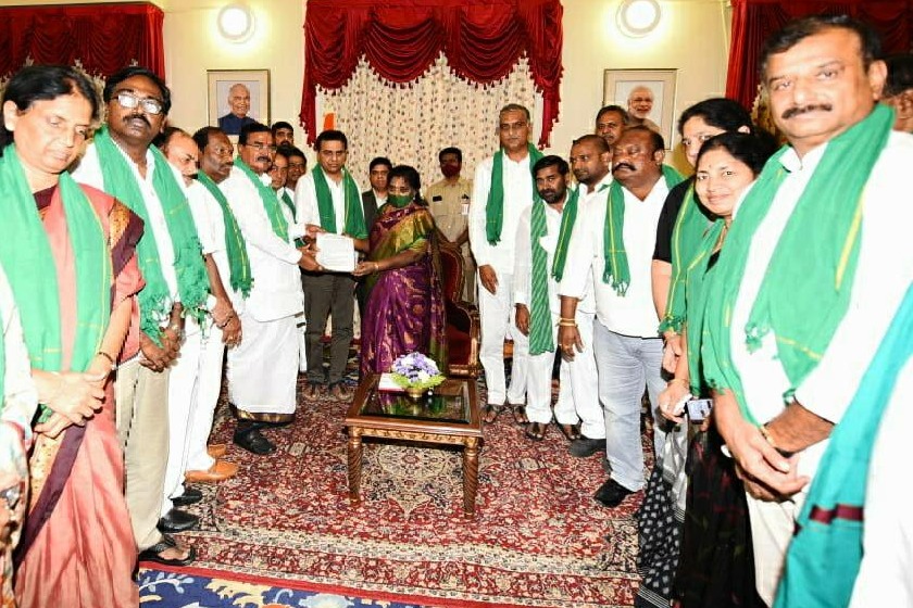 రాష్ట్ర గవర్నర్ తమిళిసై సౌందరరాజన్ ను కలిసి, ధాన్యం కొనుగోలుపై తమ డిమాండ్లతో కూడిన పత్రాన్ని వారు ఆమెకు అందజేశారు. రాష్ట్రంలో యాసంగి వరిసాగు, ధాన్యం సేకరణ అంశాలను కేంద్రం దృష్టికి తీసుకెళ్లాలని టీఆర్ఎస్ నేతలు కోరారు. గవర్నర్ ను కలిసిన వారిలో మంత్రులు మహమూద్ అలీ, హరీశ్ రావు, నిరంజన్ రెడ్డి, పువ్వాడ అజయ్ కుమార్, సత్యవతి రాథోడ్, సబితా ఇంద్రారెడ్డి, శ్రీనివాస్ గౌడ్, కొప్పుల ఈశ్వర్, ఇంద్రకరణ్ రెడ్డి ఉన్నారు.