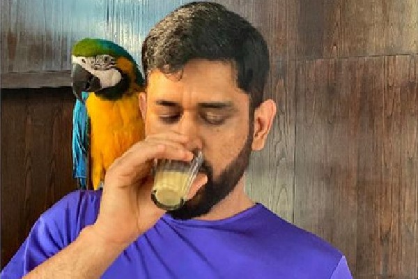 • ధోనీ టీ తాగుతుండగా భుజంపై కూర్చున్న చిలుక