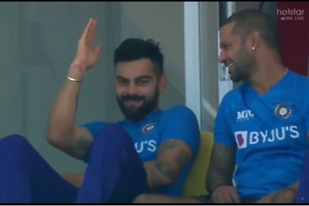 పంత్ సిక్స్ కొట్టినప్పుడల్లా చిందులేశాడు. కుర్చీలో కూర్చొనే చిరుమందహాసంతో చేతులు, ఒంటిని ఆడిస్తూ డ్యాన్స్ చేశాడు. కోహ్లీ డ్యాన్స్ చేస్తుంటే పక్కనే ఉన్న శిఖర్ ధవన్, లెగ్ స్పిన్నర్ చాహల్ కూడా నవ్వుతూ ఎంజాయ్ చేశారు. ఆ వీడియో కాస్తా ఇప్పుడు వైరల్ అయింది.