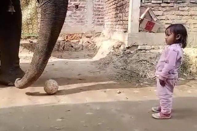 మూడేళ్ల చిన్నారి ఏనుగుతో కలివిడిగా ఉండటం చూసేవారిని ఆశ్చర్యానికి గురి చేస్తోంది. అసోంలోని గోలాఘాట్ జిల్లాకు చెందిన మూడేళ్ల బోర అనే బాలిక కుటుంబం ఏనుగు సంరక్షణ బాధ్యతల్లో ఉంది. దీంతో ఏనుగుతో అప్పుడప్పుడు ఫుట్ బాల్ ఆడుకోవడం ఈ చిన్నారికి సాధారణంగా మారిపోయింది.