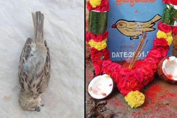 గ్రామంలో చాలా పిచ్చుకలు ఉండగా వాటిలో ఒకటి మాత్రం ప్రతి రోజూ అన్ని ఇళ్లకు వచ్చేది. వారు వేసే గింజలు తిని వెళ్లేది. దీంతో ఆ పిచ్చుకపై గ్రామస్థులు ఎనలేని మమకారం పెంచుకున్నారు. గత నెల 26న ఆ పిచ్చుక అకస్మాత్తుగా మరణించింది. అది చూసి గ్రామస్థులు తట్టుకోలేకపోయారు. కన్నీళ్లు పెట్టుకున్నారు. మనుషుల్లా దానికీ అంత్యక్రియలు నిర్వహించారు. దశదిన కర్మ జరిపించి తిరిగి రావాలని శ్రద్ధాంజలి ఘటిస్తూ గ్రామంలో పోస్టర్లు ఏర్పాటు చేశారు. శాస్త్రోక్తంగా పూజలు నిర్వహించిన అనంతరం అందరికీ భోజనాలు పెట్టారు.