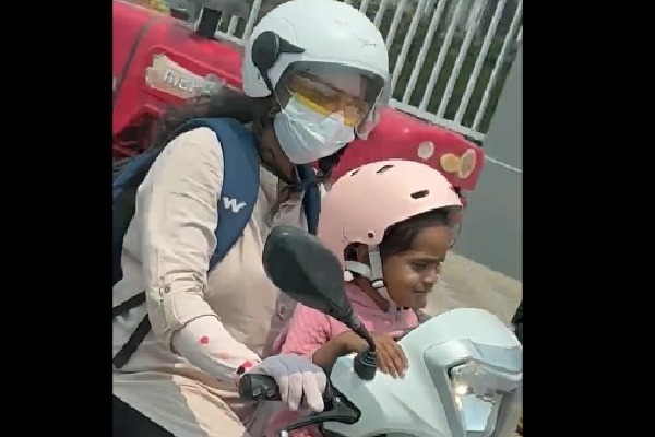 - ఆ మహిళతో పాటు ఆమె కూతురు తలపై కూడా హెల్మెట్