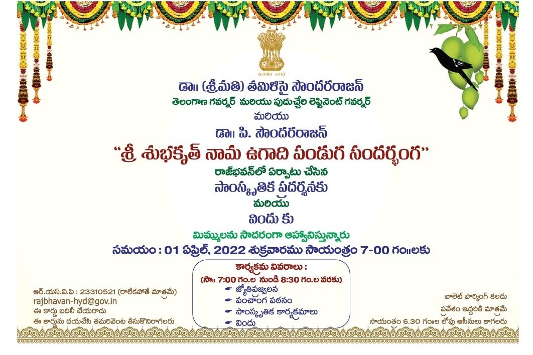 తెలుగు సంవ‌త్స‌రాది ఉగాదిని పుర‌స్క‌రించుకుని తెలంగాణ రాజ‌ధాని హైద‌రాబాద్‌లోని రాజ్ భ‌వ‌న్‌లో ఆ రాష్ట్ర గ‌వ‌ర్న‌ర్ త‌మిళిసై సౌంద‌ర‌రాజ‌న్ ఆధ్వ‌ర్యంలో శుక్ర‌వారం ఉగాది వేడుక‌లు జ‌రిగాయి. ఈ వేడుక‌ల‌కు బీజేపీ ఎమ్మెల్యే ర‌ఘునంద‌న్ రావు, మ‌హారాష్ట్ర మాజీ గ‌వ‌ర్న‌ర్ సీహెచ్ విద్యాసాగ‌ర్ రావు, సీపీఐ నేత చాడా వెంక‌ట్ రెడ్డిలు హాజ‌ర‌య్యారు.