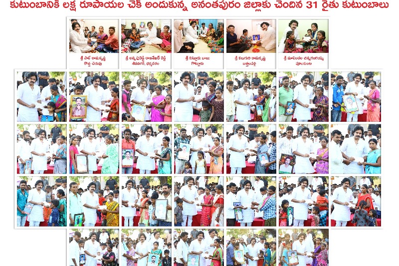 ఈ మేరకు రైతు భరోసా యాత్ర మొదటి విడతలో భాగంగా అనంతపురం జిల్లాలో ఆత్మహత్యలకు పాల్పడిన 31 మంది కౌలు రైతుల కుటుంబాలను పరామర్శించి, ఒక్కొక్క రైతు కుటుంబానికి లక్ష రూపాయల చొప్పున ఆర్థిక సహాయాన్ని పవన్ అందించారని జనసేన మంగళవారం నాడు ఓ ప్రకటనను విడుదల చేసింది.