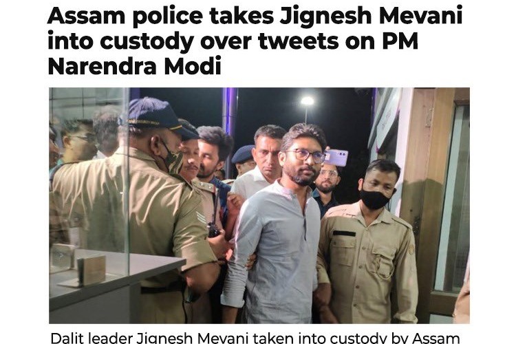 రాష్ట్రీయ దళిత్ అధికార్ మంచ్ కన్వీనర్, గుజరాత్ ఎమ్మెల్యే జిగ్నేష్ మేవానీని అస్సాం పోలీసులు అరెస్ట్ చేశారు. ట్విట్టర్ వేదికగా మేవానీ పోస్ట్ చేసిన ఓ ట్వీట్పై బీజేపీ కార్యకర్త చేసిన ఫిర్యాదు ఆధారంగా మేవానీని అరెస్ట్ చేసినట్లు అస్సాం పోలీసులు ప్రకటించారు. బుధవారం రాత్రి గుజరాత్లోని పాలంపూర్ సర్క్యూట్ హౌస్లో అరెస్ట్ చేసిన మేవానీని గురువారం ఉదయం అస్సాంలోని గువాహటికి తరలించినట్లు అస్సాం పోలీసులు తెలిపారు.