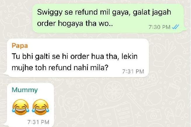 ‘తప్పుడు అడ్రస్ కు ఆర్డర్ చేసిన దానికి సంబంధించి స్విగ్గీ నుంచి రిఫండ్ (డబ్బులు వాపసు) వచ్చింది’ అని తల్లిదండ్రుల వాట్సప్ గ్రూప్ లో మెసేజ్ చేశాడు. దీనికి ఆ తండ్రి నుంచి అనూహ్యమైన రీప్లై వచ్చింది. ‘నిన్ను కూడా పొరపాటున ఆర్డర్ చేశాం. కానీ, నాకు ఇంకా రిఫండ్ రాలేదు’ అని సెటైర్ వేశాడు. ఈ సంభాషణ స్ర్కీన్ షాట్ ను జితు ట్విట్టర్లో షేర్ చేయడంతో అది వైరల్ అయింది. తండ్రి రిప్లై చూసి నెటిజన్లు తెగ నవ్వేసుకుంటున్నారు.