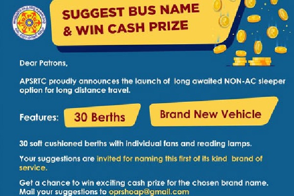 ఏపీఎస్ ఆర్టీసీ త్వరలోనే దూర ప్రాంత ప్రయాణికుల కోసం కొత్తగా నాన్ ఎసీ స్లీపర్ బస్సులను ప్రవేశపెడుతోంది. ఒక్కో బస్సులో 30 బెర్తులు, ప్రతి బెర్త్కు ఫ్యాన్, రీడింగ్ ల్యాంప్ ఉంటాయి. ఈ బస్సులకు మంచి పేరు పెట్టాలని ఆర్టీసీ కోరుతోంది. బ్రాండ్ ఇమేజ్ పెరిగేలా పేరు సూచించిన వారికి బహుమతి అందిస్తామని ఆ సంస్థ ఎండీ ద్వారకా తిరుమలరావు తెలిపారు.