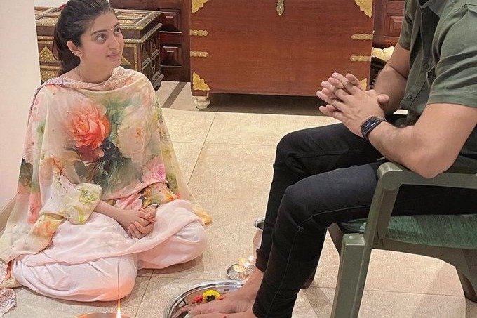 కర్ణాటకలో మహిళలు భీమన అమావాస్య పర్వదినాన్ని అత్యంత శుభకరమైన రోజుగా భావిస్తారు. ఆషాఢ మాసంలో వచ్చే ఈ భీమన అమావాస్యను నేడు (జులై 28) భక్తిశ్రద్ధలతో జరుపుకుంటున్నారు. తాజాగా, ప్రముఖ నటి ప్రణీత కూడా ఈ పండుగను ఆచరించారు. ఆమె తన భర్త నితిన్ రాజుకు పాదపూజ చేశారు. భర్త నుంచి ఆశీస్సులు అందుకున్నారు. దీనికి సంబంధించిన ఫొటోను సోషల్ మీడియాలో పంచుకున్నారు.