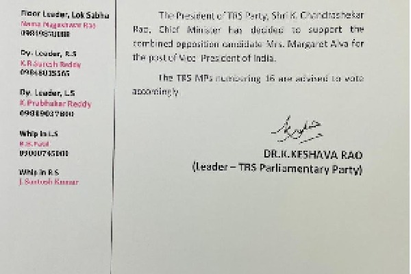 ఉప రాష్ట్రపతి ఎన్నికల్లో ప్రతిపక్షాల ఉమ్మడి అభ్యర్థి మార్గరెట్ ఆల్వాకే మద్దతు ఇస్తున్నట్టు తెలంగాణ రాష్ట్ర సమితి (టీఆర్ఎస్) అధికారికంగా ప్రకటించింది. ఈ మేరకు టీఆర్ఎస్ పార్లమెంటరీ పార్టీ శుక్రవారం ఒక ప్రకటన విడుదల చేసింది. ఉప రాష్ట్రపతి ఎన్నికల్లో విపక్షాల అభ్యర్థి మార్గరెట్ ఆల్వాకు మద్దతు ఇవ్వాలని టీఆర్ఎస్ అధినేత, సీఎం కేసీఆర్ నిర్ణయించారని టీఆర్ఎస్ పార్లమెంటరీ పార్టీ నేత కె.కేశవరావు వెల్లడించారు. టీఆర్ఎస్ కు చెందిన రాజ్యసభ, లోక్ సభ సభ్యులు కలిపి మొత్తం 16 మంది ఇందుకు అనుగుణంగా ఓటు వేయాలని ఆదేశించారు.