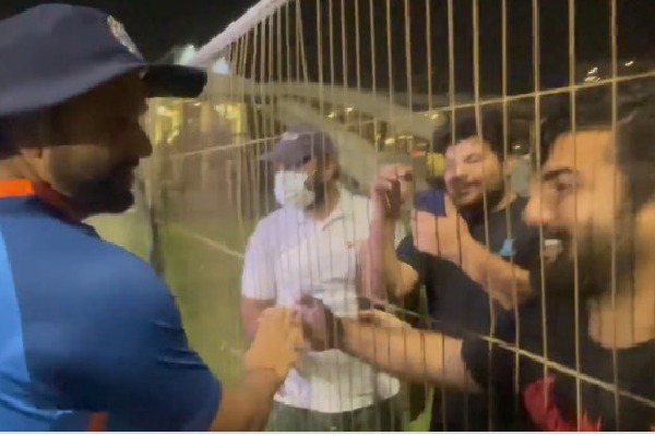 కాగా, ఫ్లడ్ లైట్ల వెలుతురులో టీమిండియా ప్రాక్టీసు చేస్తుండగా, కొందరు అభిమానులు టీమిండియా సారథి రోహిత్ శర్మను కలిసేందుకు వచ్చారు. వారు పాకిస్థాన్ కు చెందినవారు. గ్రౌండ్ వెలుపల ఉన్న వారి కోసం రోహిత్ శర్మ మైదానం ఫెన్సింగ్ దాటి మరీ వచ్చాడు. అభిమానుల చేతులను తాకుతూ వారికి ఆనందాన్ని పంచాడు. వారిలో ఓ అభిమాని హగ్ కోరగా, ఫెన్సింగ్ అడ్డుగా ఉండడంతో, ఇవతలి నుంచే ఆత్మీయంగా భుజానికి భుజం తాకించి అతడిని సంతోషపెట్టాడు.