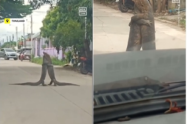 కుక్కపిల్లలో, పిల్లులో కొట్టుకోవడం అప్పుడప్పుడూ చూస్తూనే ఉంటాం. కొన్నిసార్లు ఓ జంతువు మరో జంతువు వెంటపడుతూ పరుగెత్తడమూ కనిపిస్తుంది. కానీ రెండు భారీ పరిమాణంలోని బల్లులు రోడ్డు మీదికి వచ్చి కొట్టుకుంటుంటే.. అదీ ఏడెనిమిదేళ్ల పిల్లల అంత పెద్దగా ఉండే బల్లులు అయితే.. వామ్మో అనిపిస్తుంది కదా. థాయిలాండ్ లో ఇటీవలే ఇలాంటి ఘటన జరిగింది. మానిటర్ లిజర్డ్స్ గా పిలిచే భారీ రకం బల్లులు రెండు నడి రోడ్డు మీదికి వచ్చి.. రెజ్లింగ్ చేస్తున్నట్టుగా ఒకదాన్ని ఒకటి పట్టుకుని నిలబడిపోయి అందరినీ కంగారు పెట్టించాయి.