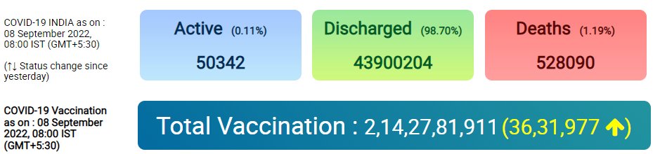 ఇక ఇప్పటి వరకు కరోనా మహమ్మారి కారణంగా మరణించిన వారి సంఖ్య 5,28,090కి చేరుకుంది. ప్రస్తుతం దేశంలో 50,342 యాక్టివ్ కేసులు ఉన్నాయి. దేశంలో రోజువారీ పాజిటివిటీ రేటు 1.96 శాతంగా, క్రియాశీల రేటు 0.11 శాతంగా, రికవరీ రేటు 98.70 శాతంగా, మరణాల రేటు 1.19 శాతంగా ఉన్నాయి. ఇప్పటి వరకు 2,14,27,81,911 డోసుల కరోనా వ్యాక్సిన్ పంపిణీ చేశారు. నిన్న 36,31,977 మంది వ్యాక్సిన్ వేయించుకున్నారు.