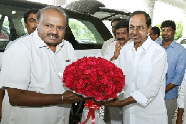 కర్ణాటక మాజీ ముఖ్యమంత్రి, జేడీఎస్ నేత కుమారస్వామి ఆదివారం తెలంగాణ రాష్ట్ర ముఖ్యమంత్రి నివాసం ప్రగతిభవన్ కు వచ్చారు. సీఎం కేసీఆర్, పలువురు నేతలు ఆయనకు స్వయంగా స్వాగతం పలికారు. తర్వాత కేసీఆర్, కుమారస్వామి కలిసి భోజనం చేశారు. అనంతరం భేటీ అయి చర్చించారు. తాజా రాజకీయ పరిస్థితులు, దేశంలో రాజకీయ పరిణామాలపై వారు మాట్లాడుకున్నట్టు ప్రగతి భవన్ వర్గాలు చెబుతున్నాయి. జాతీయ రాజకీయాల్లో ప్రాంతీయ పార్టీల పాత్ర, కేసీఆర్ కొత్త జాతీయ పార్టీ ఏర్పాటు, భవిష్యత్ కార్యాచరణపై వారు చర్చించినట్టు సమాచారం.