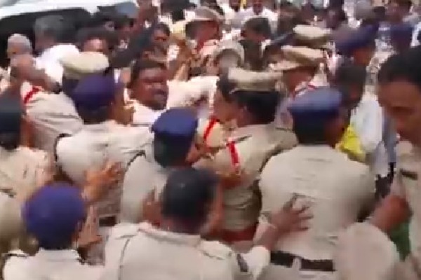 అయితే, టీడీపీ నేతలను పోలీసులు టీడీపీ కార్యాలయం వద్దే అడ్డుకున్నారు. ఫిర్యాదు అందిస్తే ఇక్కడే తీసుకుంటామని చెప్పిన పోలీసులు, అక్కడ బారికేడ్లు, రోప్ లు ఏర్పాటు చేశారు. తాము పోలీస్ స్టేషన్ వద్దే ఫిర్యాదు చేస్తామని టీడీపీ నేతలు పట్టుబట్టడంతో అక్కడ ఉద్రిక్తత ఏర్పడింది. ఇరువర్గాల మధ్య వాగ్యుద్ధం నడిచింది.