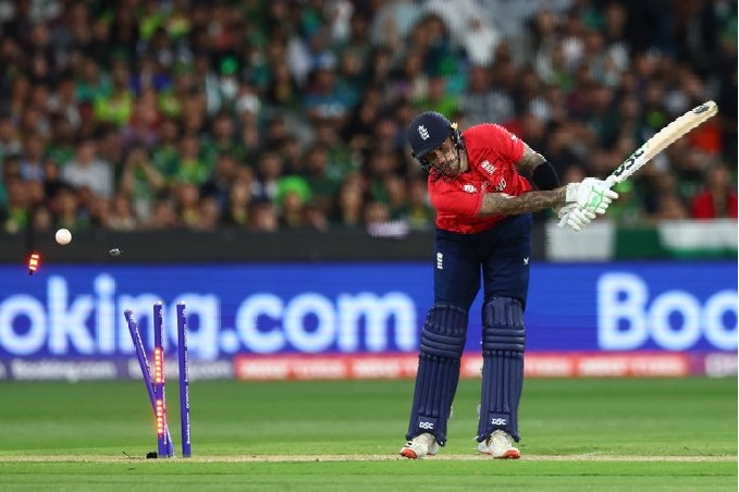 పాక్ బౌలర్లు షహీన్ అఫ్రిది, హరీస్ రవూఫ్ కొత్తబంతితో ప్రభావవంతంగా బౌలింగ్ చేశారు. అఫ్రిది ప్రమాదకర ఓపెనర్ అలెక్స్ హేల్స్ (1) ను ఓ అద్భుతమైన ఇన్ స్వింగర్ తో బౌల్డ్ చేయగా, 10 పరుగులు చేసిన ఫిల్ సాల్ట్ ను హరీస్ రవూఫ్ అవుట్ చేశాడు. ఆ తర్వాత కాసేపటికే దూకుడు మీదున్న బట్లర్ (26) ను హరీస్ రవూఫ్ అవుట్ చేయడంతో ఇంగ్లండ్ మూడో వికెట్ కోల్పోయింది.