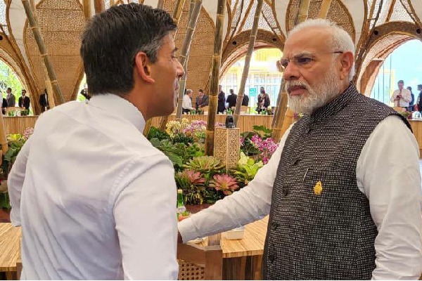 వాస్తవానికి జీ20 సదస్సులో భాగంగా భారత్, బ్రిటన్ దేశాల మధ్య ద్వైపాక్షిక చర్చలు బుధవారం జరగనున్నాయి. ఈ చర్చల్లో తమ తమ దేశాల అధికార ప్రతినిధులతో కలిసి మోదీ, సునాక్ పాలుపంచుకోనున్నారు. అయితే ఒకే దేశానికి చెందిన నేతలు కావడంతో వీరిద్దరూ తొలి రోజే తారసపడిన సందర్భంగా పలకరించుకున్నారు. భారత సంతతికి చెందిన రిషి సునాక్...భారత్ ఐటీ దిగ్గజం ఇన్ఫోసిస్ వ్యవస్థాపకుల్లో ఒకరైన నారాయణ మూర్తి కుమార్తెను వివాహం చేసుకున్న సంగతి తెలిసిందే. ఈ కారణంగానే బ్రిటన్ ప్రధానిగా సునాక్ పదవీ బాధ్యతలు చేపట్టగానే... భారత్ ప్రజలు హర్షం వ్యక్తం చేశారు.