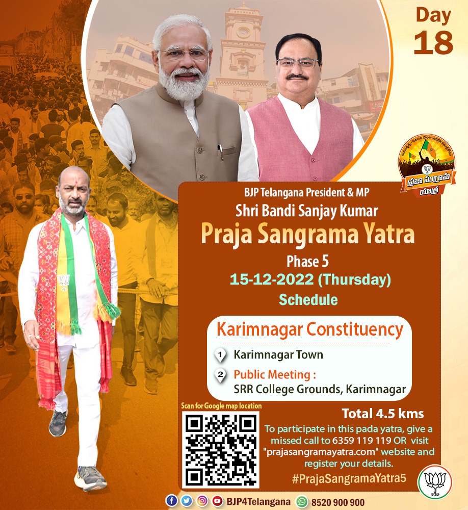 ఈ మధ్యాహ్నం 2.10 నిమిషాలకు నడ్డా హైదరాబాద్ శంషాబాద్ ఎయిర్ పోర్టుకు చేరుకుంటారు. అక్కడి నుంచి బయల్దేరి 3.30 గంటలకు కరీంనగర్ కు చేరుకుంటారు. 3.40 గంటలకు సభాస్థలికి చేరుకుంటారు. సభలో ప్రసంగించిన తర్వాత కరీంనగర్ నుంచి బయల్దేరి హైదరాబాద్ కు చేరుకుంటారు. సాయంత్రం 5.35 గంటలకు హైదరాబాద్ నుంచి ఢిల్లీకి బయల్దేరుతారు. గత నెల 28న నిర్మల్ జిల్లా భైంసాలో బండి సంజయ్ పాదయాత్ర ప్రారంభమయింది. 18 రోజుల పాటు ఐదు జిల్లాల్లో 222 కిలోమీటర్ల మేర యాత్ర కొనసాగింది. నిర్మల్, ఖానాపూర్, వేములవాడ, జగిత్యాల, చొప్పదండి, ముథోల్, కరీంనగర్ నియోజకవర్గాల్లో యాత్ర కొనసాగింది.