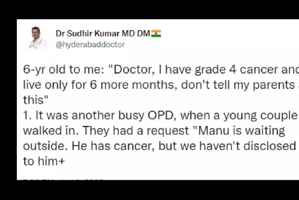 హైదరాబాద్ లోని అపోలో హాస్పిటల్ కు చెందిన న్యూరాలజిస్ట్ డాక్టర్ సుధీర్ కుమార్ తన ట్విట్టర్ లో ఈ వివరాలు పంచుకున్నారు. బ్రెయిన్ క్యాన్సర్ తో బాధపడుతున్న ఆరేళ్ల కుర్రాడు మనూను చెకప్ కోసం పేరెంట్స్ తన దగ్గరకు తీసుకొచ్చారని డాక్టర్ సుధీర్ చెప్పారు. రిపోర్టులు పరిశీలించాక మనూ పేరెంట్స్ తో విడిగా మాట్లాడానని.. తమ కొడుకుకు క్యాన్సర్ విషయం తెలియనివ్వొద్దని పేరెంట్స్ చేసిన విజ్ఞప్తిని మన్నించినట్లు తెలిపారు. ఆ తర్వాత మనూ కూడా తనతో ప్రైవేటుగా మాట్లాడాడని, అప్పుడు మనూ చేసిన విజ్ఞప్తి తనను కదలించిందని చెప్పారు.