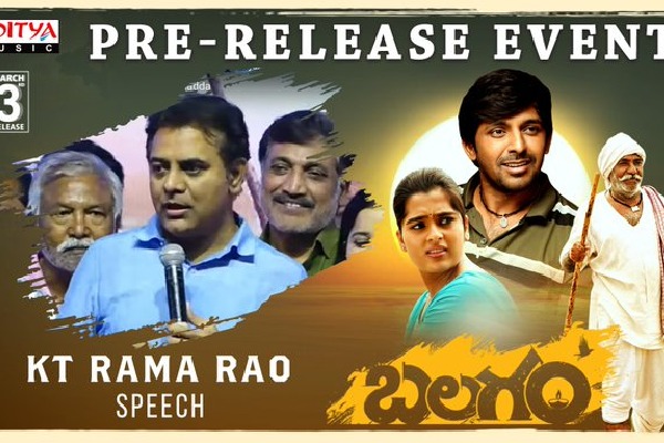 దిల్ రాజు ప్రొడక్షన్లో రూపొందిన 'బలగం' సినిమా మార్చి 3వ తేదీన థియేటర్లకు రానుంది. ఈ నేపథ్యంలో కేటీఆర్ ముఖ్య అతిథిగా ఈ సినిమా ప్రీ రిలీజ్ ఈవెంట్ 'సిరిసిల్ల'లో జరిగింది. ఈ స్టేజ్ పై ఆయన మాట్లాడుతూ .. 'బలగం' సినిమా ద్వారా బలమైన మానవ సంబంధాలను వేణు అద్భుతంగా ఆవిష్కరించాడనే విషయం నాకు అర్థమవుతోంది. దిల్ రాజు గారి పిల్లలు ఇలాంటి సినిమాల ద్వారా కొత్త టాలెంటును ప్రోత్సహించాలని కోరుతున్నాను" అన్నారు.