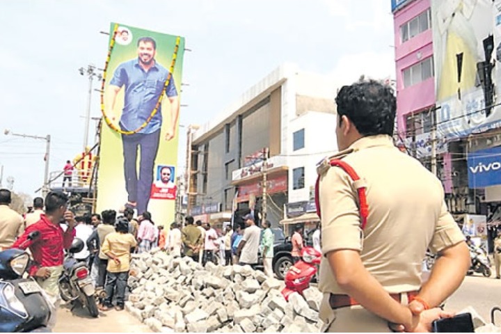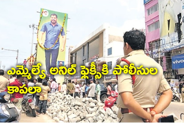 - ఫ్లెక్సీని ఎవరైనా తొలగించవచ్చనే అనుమానంతో పోలీసుల పహారా