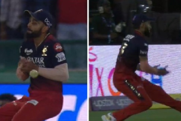 17వ ఓవర్ వేసిన హర్షల్ పటేల్ రసవత్తర ఫుల్ టాస్ వేశాడు. జితేశ్ శర్మ బంతిని బలంగా కొట్టాడు. లాంగ్-ఆన్లో మోహరించిన కోహ్లీ క్యాచ్ కోసం పరుగెత్తాడు. అయితే డీప్ మిడ్ వికెట్ లో ఫీల్డింగ్ చేస్తున్న సుయాష్ ప్రభుదేశాయ్ కూడా క్యాచ్ పట్టేందుకు పరుగు పెట్టాడు. సుయాష్ క్యాచ్ పట్టేందుకు పరుగెత్తడం చూసిన కోహ్లీ... నా కంట్రోల్ లో ఉందని, నేను చూసుకుంటానని సైగ చేశాడు. సాధారణంగా కోహ్లీ క్యాచ్ ను అంత సులభంగా వదిలేయడు. కానీ ఇక్కడ సుయాష్ కు చెప్పి మరీ ఆ బాల్ ను పట్టలేకపోయాడు. బాల్ ను పట్టుకోవడానికి కోహ్లీ తన రెండు చేతులను గాలిలో ఉంచాడు. కానీ క్యాచ్ పట్టడంలో విఫలమయ్యాడు.