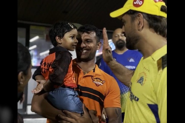 సన్ రైజర్స్ బౌలర్ టి.నటరాజన్ తన భార్య, కుమార్తెతో కలిసి ధోనీ వద్దకు వచ్చాడు. నటరాజన్ కుమార్తెను చూడగానే ధోనీ చిరునవ్వు చిందిస్తూ చేయి కలిపేందుకు ప్రయత్నించాడు. అయితే ఆ చిన్నారి... ధోనీతో చేయి కలిపేందుకు నిరాకరించింది. ఆ పాపను ఆకట్టుకునేందుకు ధోనీ అనేక కబుర్లు చెప్పినా ఫలితం లేకపోయింది.
