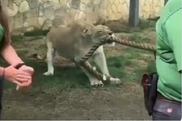 ఓ గట్టి తాడు కొసను ఆడ సింహం నోటితో పట్టుకోగా... ఆ తాడు మరో కొసను ముగ్గురు బాడీ బిల్డర్లు పట్టుకున్నారు. వాళ్లు ఎంత కష్టపడినా ఆ ఆడ సింహాన్ని అంగుళం కూడా కదల్చలేకపోయారు. ఆ ముగ్గురు బలాఢ్యులు ఆపసోపాలు పడ్డారు కానీ, అవతలివైపు ఉన్న సింహం మాత్రం "ఓస్ ఇంతేనా" అన్నట్టుగా తన శక్తిని ఘనంగా ప్రదర్శించింది. దీనికి సంబంధించిన వీడియో వైరల్ అవుతుంది.