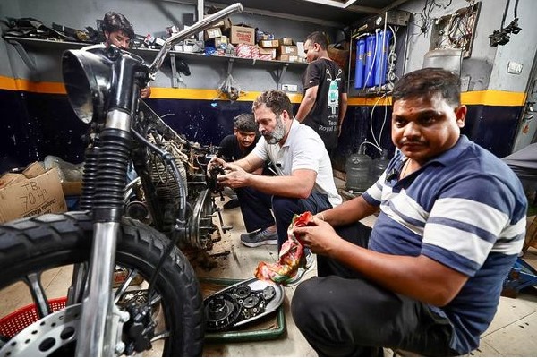 కాంగ్రెస్ అగ్రనేత రాహుల్ గాంధీ తన బిజీ షెడ్యూల్ ని పక్కన పెట్టి బైక్ మెకానిక్ గా మారారు. బైక్ ను రిపేర్ చేశారు. ఢిల్లీ కరోల్ బాగ్ లోని సైకిల్ మార్కెట్ లో ఉన్న ఒక బైక్ మెకానిక్ వర్క్ షాప్ కు రాహుల్ వెళ్లారు. బైక్ ను ఎలా రిపేర్ చేయాలో మెకానిక్ లను అడిగి తెలుసుకున్నారు. సైకిల్ మార్కెట్ లోని వ్యాపారులు, మెకానిక్ లు, కార్మికులతో ముచ్చటించారు. వీటికి సంబంధించిన ఫొటోలను రాహుల్ గాంధీ ఫేస్ బుక్ లో పోస్ట్ చేశారు. రెంచీలను తిప్పుతూ మన దేశ చక్రాలు ముందుకు సాగేలా చేస్తున్న వారి నుంచి ఎంతో నేర్చుకున్నానని రాహుల్ వ్యాఖ్యానించారు.