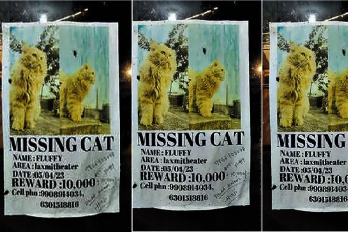 - పిల్లి ఆచూకీ చెబితే రూ.10 వేల రివార్డు ఇస్తామంటూ పోస్టర్లు