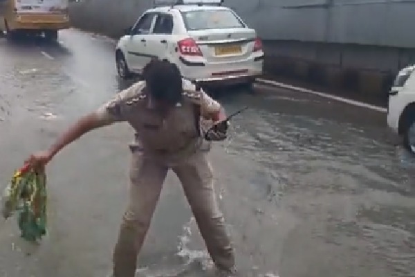 woman: రోడ్డుపై నీరు నిలవకుండా డ్రెయినేజీ పైభాగాన్ని చేత్తో శుభ్రం చేసిన మహిళా పోలీస్ అధికారి