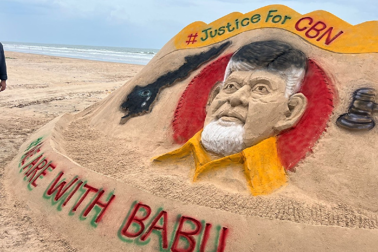 - సైకత శిల్పి బాలాజీ వరప్రసాద్ సాయంతో చంద్రబాబు చిత్రం