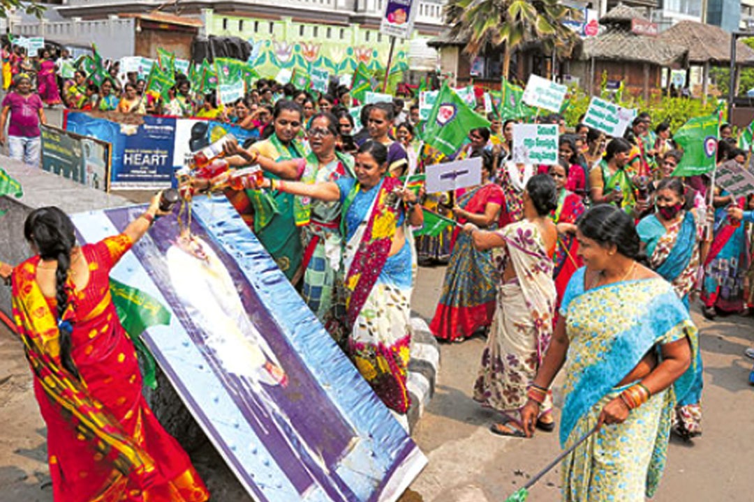 మద్యాన్ని నిషేధిస్తానని అధికారంలోకి వచ్చి ఆపై ఆ హామీని తుంగలో తొక్కారంటూ విశాఖపట్టణంలో మహిళలు కదంతొక్కారు. ముఖ్యమంత్రి జగన్కు వ్యతిరేకంగా నిరసన ప్రదర్శనలు చేపట్టారు. అంతేకాదు, మద్యంతో జగన్ ఫొటోకు అభిషేకం చేశారు.