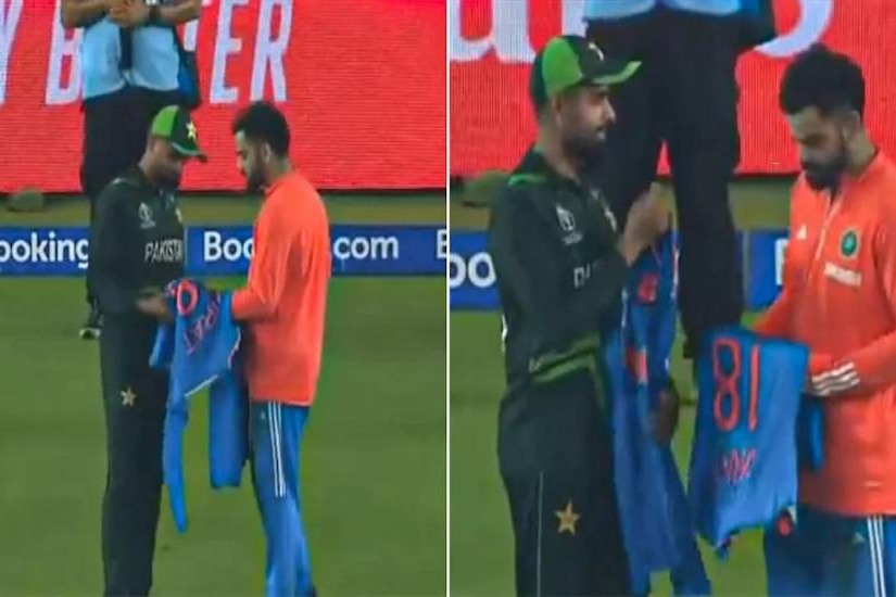 - నిన్నటి మ్యాచ్ అనంతరం స్టేడియంలో పాక్ కెప్టెన్కు జెర్సీ ఇచ్చిన కింగ్ కోహ్లీ