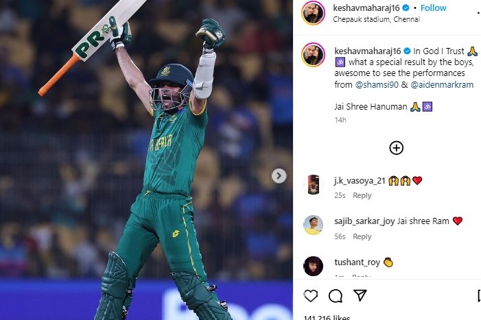 మ్యాచ్ తర్వాత కేశవ్ మహరాజ్ ఇన్ స్టా గ్రామ్ లో పెట్టిన ఒక పోస్ట్ అందరి దృష్టిని ఆకర్షిస్తోంది. ‘‘దేవుడి పట్ల నాకు నమ్మకం ఉంది. కుర్రాళ్లు ఎంత చక్కని ఫలితం సాధించారు? షమ్సి, మార్క్రమ్ ప్రదర్శన చూడ్డానికి అద్భుతంగా ఉంది. జై శ్రీ హనుమాన్’’ అని పేర్కొన్నాడు. కేశవ్ మహరాజ్ మూలాలు భారత్ లోనే ఉన్నాయి. అతడి పూర్వీకులు 1874లో దక్షిణాఫ్రికాకు వలసపోయారు. అతడి తల్లిదండ్రులు ఆత్మానంద్, కాంచనమాల.