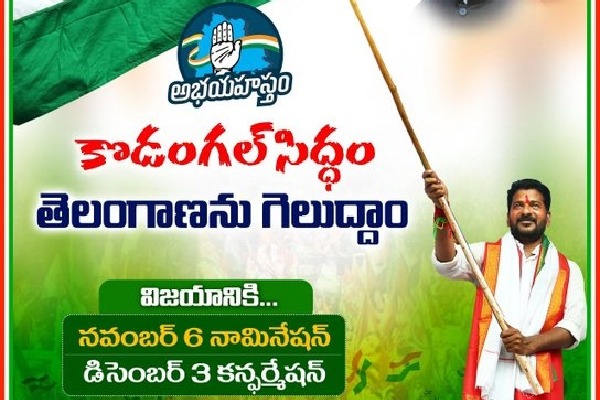 ఈమేరకు కాంగ్రెస్ జెండా చేతిలో పట్టుకుని ఉన్న ఫొటోను రేవంత్ రెడ్డి ఈ ట్వీట్ కు జతచేశారు. తెలంగాణలో కాంగ్రెస్ గెలుపును ఎవరూ ఆపలేరని ధీమా వ్యక్తం చేశారు. సోమవారం ఉదయం పది గంటలకు కొడంగల్ నియోజకవర్గంలో నామినేషన్ పత్రాలను దాఖలు చేయనున్నట్లు రేవంత్ రెడ్డి తెలిపారు.