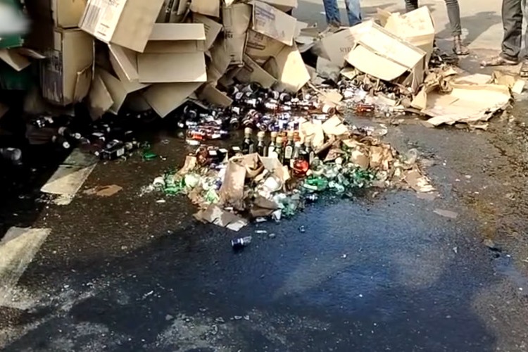 - రోడ్డుపై పడిపోయిన మద్యం బాటిళ్లు