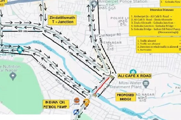 అంబర్ పేట నుంచి మూసారాంబాగ్ ఫ్లైఓవర్ మీదుగా మలక్ పేట టీవీ టవర్ వైపు వెళ్లే వాహనదారులు అలీ కేఫ్ క్రాస్ రోడ్డు వద్ద జిందాతిలిస్మాత్, గోల్నాక న్యూబ్రిడ్జి హైటెక్ ఫంక్షన్ హాల్, అప్జల్ నగర్ వైపు మళ్లిస్తున్నట్లుగా తెలిపారు. అక్కడి నుంచి ఇండియన్ ఆయిల్ పెట్రోల్ బంక్ వద్ద కుడి మలుపు తిరిగి పిస్తా హౌస్, మూసారాంబాగ్ జంక్షన్ వైపు వెళ్లాలని ట్రాఫిక్ పోలీసులు సూచించారు. ట్రాఫిక్ అంతరాయం లేకుండా వాహనదారులు ఇతర మార్గాల ద్వారా వెళ్లి సహకరించాలని సూచించారు.