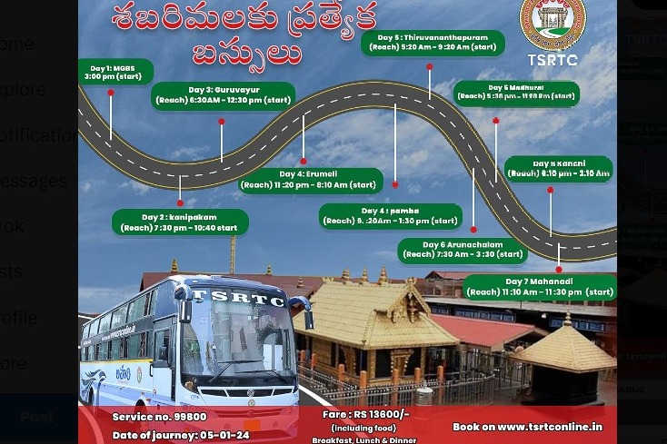 అయ్యప్పస్వామి భక్తులకు టీఎస్ఆర్టీసీ శుభవార్త చెప్పింది. స్వామివారి దర్శనం కోసం వెళ్లే భక్తులకు శబరిమలకు ప్రత్యేక బస్సులను ఏర్పాటు చేసినట్లు టీఎస్ఆర్టీసీ ప్రకటించింది. జనవరి 5వ తేదీ నుంచి బస్సు సర్వీస్లు ప్రారంభమవుతాయని తెలిపింది. టిక్కెట్ ధరను రూ.13,600గా నిర్ణయించింది. శబరిమలకు బస్సు షెడ్యూల్ ఇదీ....