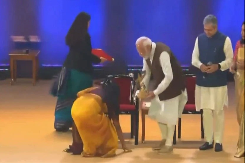 ఢిల్లీలోని భారత్ మండపంలో శుక్రవారం జరిగిన నేషనల్ క్రియేటర్స్ అవార్డ్స్ ప్రదానోత్సవం కార్యక్రమంలో ప్రధాని మోదీ చేసిన ఒక పని అందిరి హృదయాలను గెలుచుకుంది. విజేతలకు అవార్డులు ప్రదానం చేస్తున్న సమయంలో ఓ మహిళ వేదికపైకి వచ్చారు. ఆమె వచ్చి ప్రధాని మోదీ కాళ్లు మొక్కారు. అంతే.. అది చూసిన ప్రధాని వెంటనే ఆ మహిళ కాళ్లకు తనూ నమస్కరించారు.