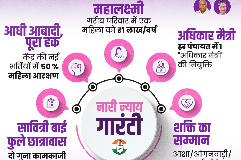 'మహాలక్ష్మి', 'ఆది ఆబది-పూరా హక్', 'శక్తి కా సమ్మాన్', 'అధికార్ మైత్రి', 'సావిత్రీబాయి ఫూలే హాస్టల్' అనే ఐదు కీలక వాగ్ధాలను మహిళల కోసం కాంగ్రెస్ పార్టీ ప్రకటించింది. మహాలక్ష్మి పథకం కింద పేద మహిళలకు రూ.1 లక్ష నగదు బదిలీ... ఆది అబది-పూరా హక్ కింద కేంద్ర ప్రభుత్వంలో చేపట్టే నియామకాల్లో 50 శాతం మహిళలకు ఇవ్వడం... శక్తి కా సమ్మాన్ పథకం కింద ఆశా, అంగన్వాడీ, మధ్యాహ్న భోజన పథకంలో విధులు నిర్వర్తించే మహిళలకు నెలవారీ జీతంలో కేంద్రం ఇచ్చే వాటా రెట్టింపు... అధికార్ మైత్రీ పథకంలో న్యాయపరమైన హక్కుల విషయంలో మహిళలను విద్యావంతులను చేసి వారికి సాధికారత కల్పించేందుకు వీలుగా ప్రతి పంచాయతీలో ఒక అధికార్ మైత్రి నియామకం... సావిత్రీబాయి పూలే హాస్టల్స్ పథకంలో భాగంగా ఉద్యోగం చేసే మహిళలకు రెట్టింపు హాస్టల్స్, ప్రతి జిల్లాలో కనీసం ఒక హాస్టల్ ఏర్పాటు చేయనున్నట్లు ప్రకటించింది.