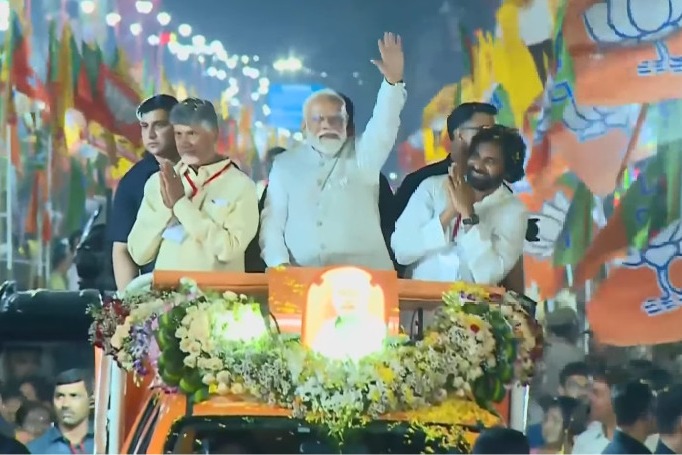 ప్రధాని నరేంద్ర మోదీ, టీడీపీ అధినేత చంద్రబాబు, జనసేనాని పవన్ కల్యాణ్ ముగ్గురూ హాజరైన భారీ రోడ్ షో విజయవాడలో ప్రారంభమైంది. పీవీపీ మాల్ నుంచి మొదలైన ఈ రోడ్ షో నగరంలోని ప్రధాన రహదారిపై అట్టహాసంగా సాగింది.