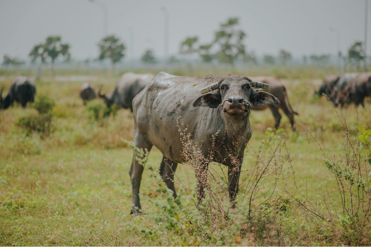 - షెడ్డులో చల్లగాలికి హాయిగా గడ్డి నెమరేస్తూ సేదతీరుతున్న గేదెలు