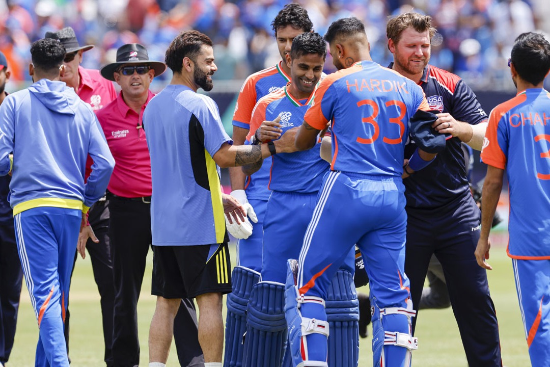 పవర్ప్లే ప్రారంభంలోనే ఓపెనర్లు విరాట్ కోహ్లీ, కెప్టెన్ రోహిత్ శర్మ ఇద్దరూ ఔట్ అయ్యారు. ఫామ్లో ఉన్న రిషబ్ పంత్ కూడా జట్టు స్కోరు 39 పరుగుల వద్ద వెనుదిరిగాడు. దీంతో జట్టు ఇబ్బందుల్లో పడినట్టు అనిపించింది. కానీ సూర్యకుమార్ యాదవ్, శివమ్ దూబే నాలుగవ వికెట్కు ఏకంగా 67 పరుగుల భాగస్వామ్యాన్ని నెలకొల్పారు. దీంతో మరో 10 బంతులు మిగిలి ఉండగానే భారత్ లక్ష్యాన్ని ఛేదించింది. సూర్యకుమార్ 49 బంతుల్లో 50 పరుగులతో నాటౌట్గా నిలిచాడు. ఇక దూబే 31 పరుగులతో నాటౌట్గా చివరి వరకు క్రీజులో ఉన్నాడు. రోహిత్ శర్మ 3, విరాట్ కోహ్లీ 0, రిషబ్ పంత్ 18 చొప్పున పరుగులు చేశారు. ఇక అమెరికా బౌలర్లలో సౌరబ్ నేత్రవాల్కర్ 2, అలీ ఖాన్ 1 వికెట్ తీశారు.