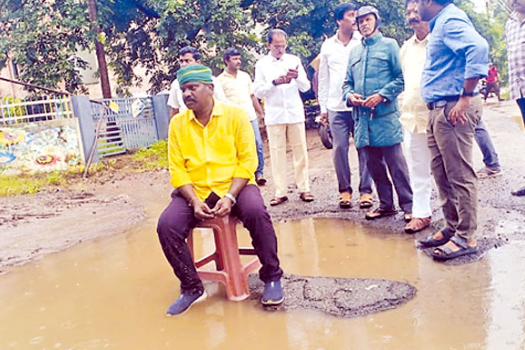 - గుంతలో స్టూలు వేసుకుని కూర్చుని కొలికపూడి నిరసన