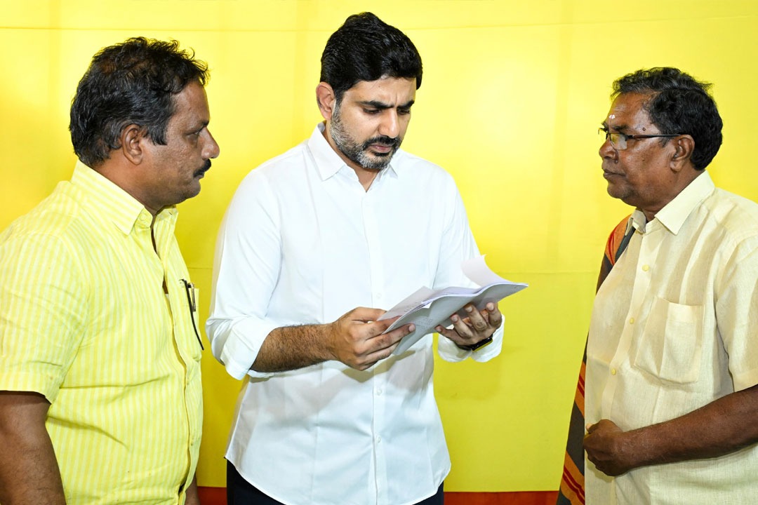 మంగళగిరి నియోజకవర్గం శృంగారపురానికి చెందిన మొవ్వా చంద్రశేఖర్ రావు, పొట్లూరి గౌతమ్, కావూరి నరసింహారావు నారా లోకేశ్ ను కలిశారు. విశాఖ మధురవాడలో నేషనల్ హైవే-5, బీచ్ రోడ్డు విస్తరణలో తమ భూములు కోల్పోయామని, తగిన నష్టపరిహారం ఇప్పించాలని విజ్ఞప్తి చేశారు. పరిశీలించి తగిన చర్యలు తీసుకుంటామని మంత్రి హామీ ఇచ్చారు.