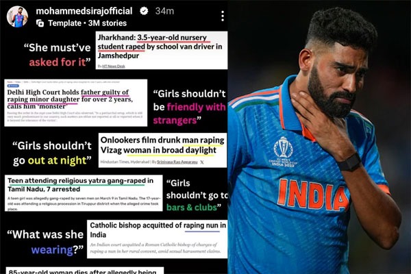 ఈ ఘటనపై తాజాగా సోషల్ మీడియా వేదికగా టీమిండియా ఫాస్ట్ బౌలర్ మహమ్మద్ సిరాజ్ స్పందించాడు. పితృస్వామ్య వ్యవస్థపై ఆగ్రహం వ్యక్తం చేస్తూ అతడు తన అధికారిక ఇన్స్టాగ్రామ్ హ్యాండిల్లో ఓ పోస్ట్ పెట్టాడు. ఇప్పుడీ పోస్ట్ సామాజిక మాధ్యమాల్లో వైరల్ అవుతోంది.