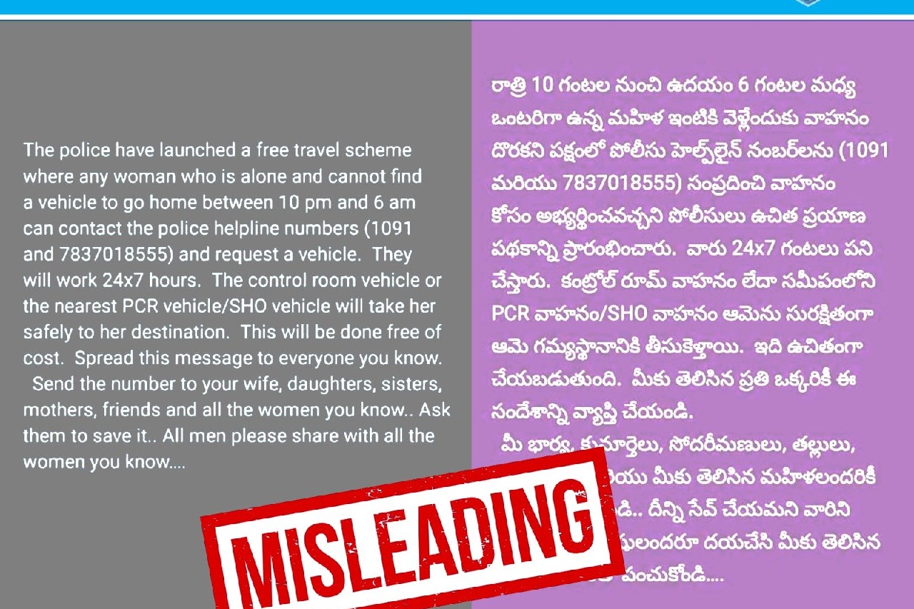 1091, 78370 18555 నెంబర్లకు ఫోన్ చేస్తే స్థానిక పోలీసు వాహనం వచ్చి మహిళలను ఇంటి వద్ద దింపుతోందని సోషల్ మీడియాలో వస్తోందని, కానీ అందులో వాస్తవం లేదని హైదరాబాద్ పోలీసులు వెల్లడించారు. రాత్రి వేళల్లో మహిళలకు ఉచిత రవాణా సౌకర్యం పేరిట తప్పుడు ప్రచారం జరుగుతోందని పేర్కొన్నారు.