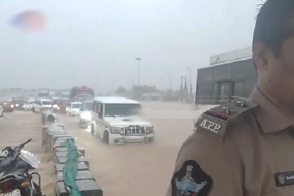 కాగా, మంగళగిరి సమీపంలోని కాజ టోల్ గేట్ వద్ద నీరు రోడ్డుపై ప్రవహిస్తోంది. ఇక్కడ భారీ ఎత్తున ట్రాఫిక్ నిలిచిపోయే పరిస్థితి ఏర్పడింది. దాంతో, సిబ్బంది టోల్ గేట్ వద్ద ఎలాంటి ఫీజు వసూలు చేయకుండానే వాహనాలను పంపించి వేస్తున్నారు. అయినప్పటికీ ట్రాఫిక్ అస్తవ్యస్తంగా మారింది.