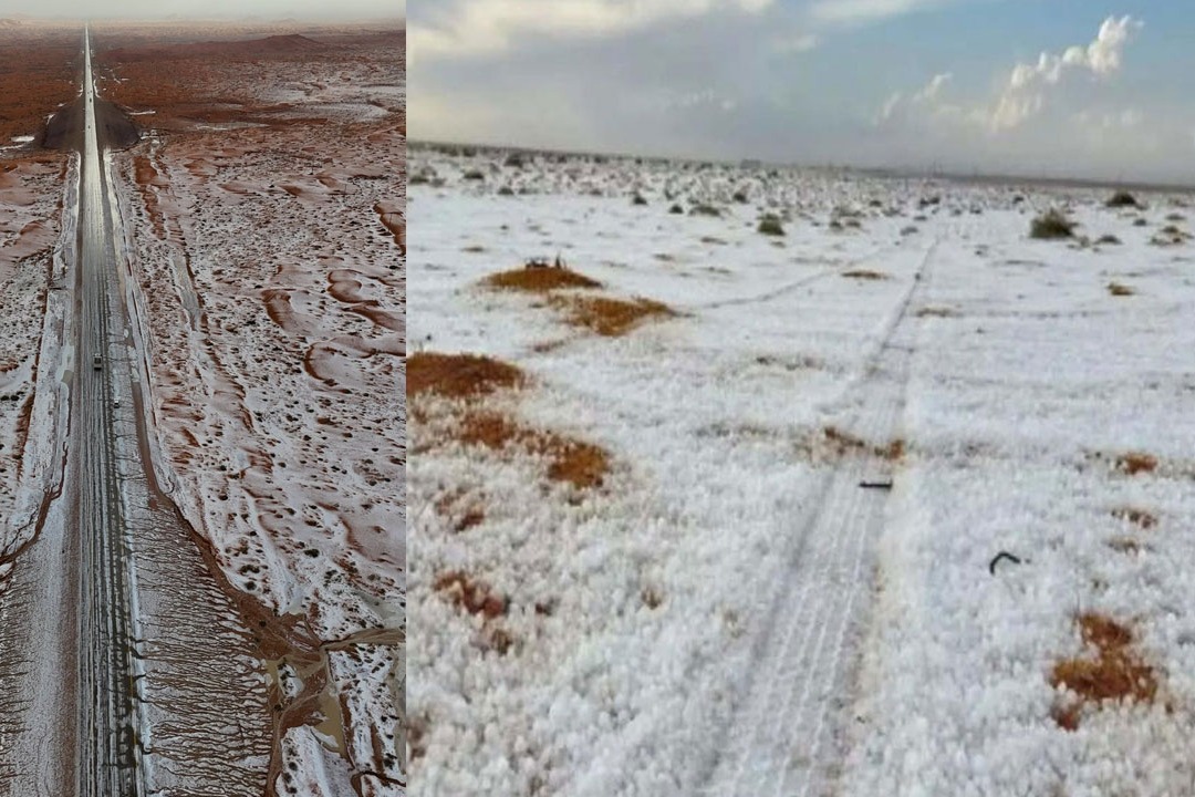 గల్ఫ్ దేశం సౌదీ అరేబియాలో ఎండలు తీవ్రంగా ఉంటాయనే విషయం తెలిసిందే. అయితే చరిత్రలో ఎప్పుడూ చూడని విధంగా ప్రస్తుతం విభిన్నమైన వాతావరణ పరిస్థితులు అక్కడ నెలకొన్నాయి. ఎడారిలోని పలు ప్రాంతాల్లో భారీగా హిమపాతం పడుతోంది. నేలపై తెల్లగా పేరుకుపోయిన మంచు స్థానికులను అమితాశ్చర్యానికి గురిచేస్తోంది. శీతాకాలం రాకముందే మంచు కురుస్తోందని స్థానికులు చెబుతున్నారు. కొన్ని ప్రాంతాల్లో ఇటీవల భారీగా వర్షాలు పడ్డాయని, ఇప్పుడు మంచు కురుస్తోందంటూ స్థానికులు సోషల్ మీడియా వేదికగా ఫొటోలు, వీడియోలు షేర్ చేశారు.