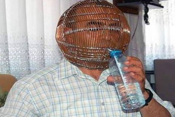- తన తలకు ఇనుప తీగలతో చేసిన బంతి లాంటి హెల్మెట్ ధరిస్తున్న వైనం